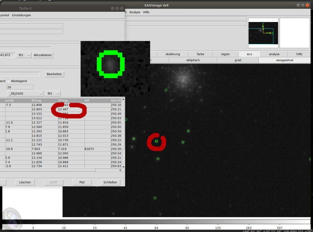 Es zeigte sich, dass das Bild von M13 nach dem Bestimmen der Koordinaten mit Astrometry.net und ein Overlay mit dem Tycho-2-Katalog (der hat nicht so irrsinnig viele Sterne) Sterne mit 12,4mag noch grade erkennbar zeigt. Für mich war das bei 6 sec. Belichtung mit einer 70mm Optik doch recht erstaunlich.
