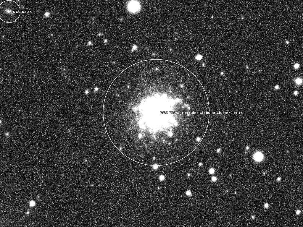 Das neue Bild mit dem WCS-Informationen ist mit der Dateiendung „.new“ versehen. Es handelt sich um ein FITS-File und kann z.B. mit Gimp geöffnet werden. Andere Programme wie z.B. ds9 können auf ein gelöstes Bild Katalog-Informationen wie Sterne einblenden. Weiterhin wurden bei dem Beispiel drei png-Bilder erzeugt, eines zeigt die NGC-Objekte NGC 6205 (M13) und NGC 6207 (war ebenfalls auf dem Bild) ein weiteres Bild zeigt eingeblendete Sterne und die Konstellation, welche zur Lösung des Bildes gedient hat und das dritte Bild nur die eingeblendeten Sternenobjekte ohne Lösungsinformationen: