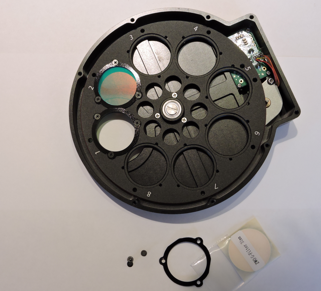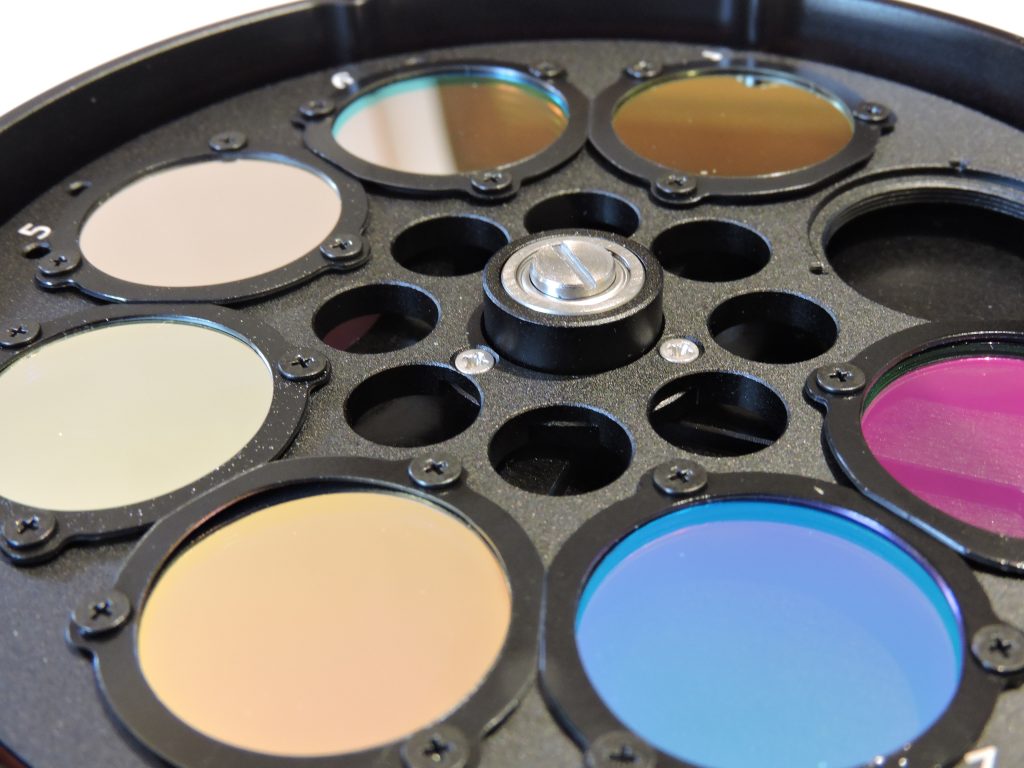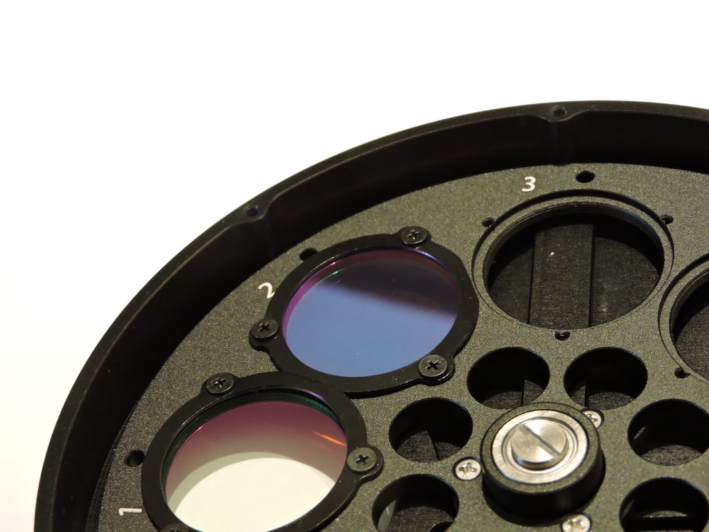 Vor der Kamera sitzt ein Filterrad mit 8 Positionen ebenfalls von ZWO. Dieses Rad ist bei mir mit folgenden Filtern bestückt: