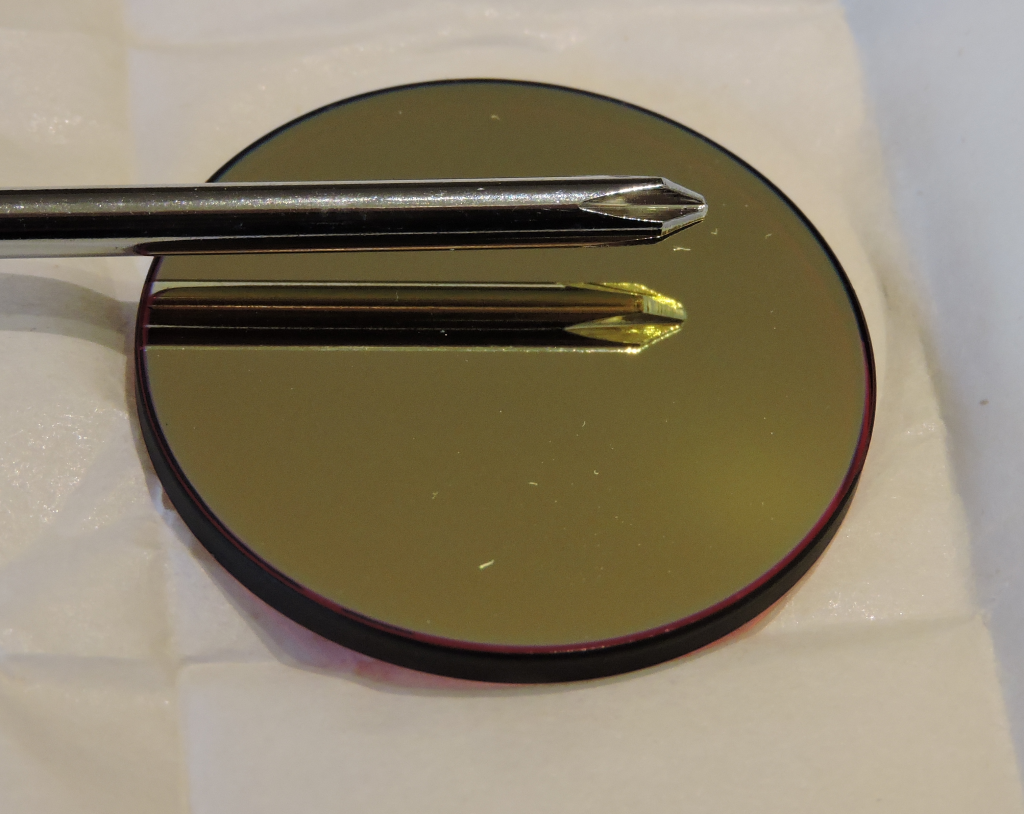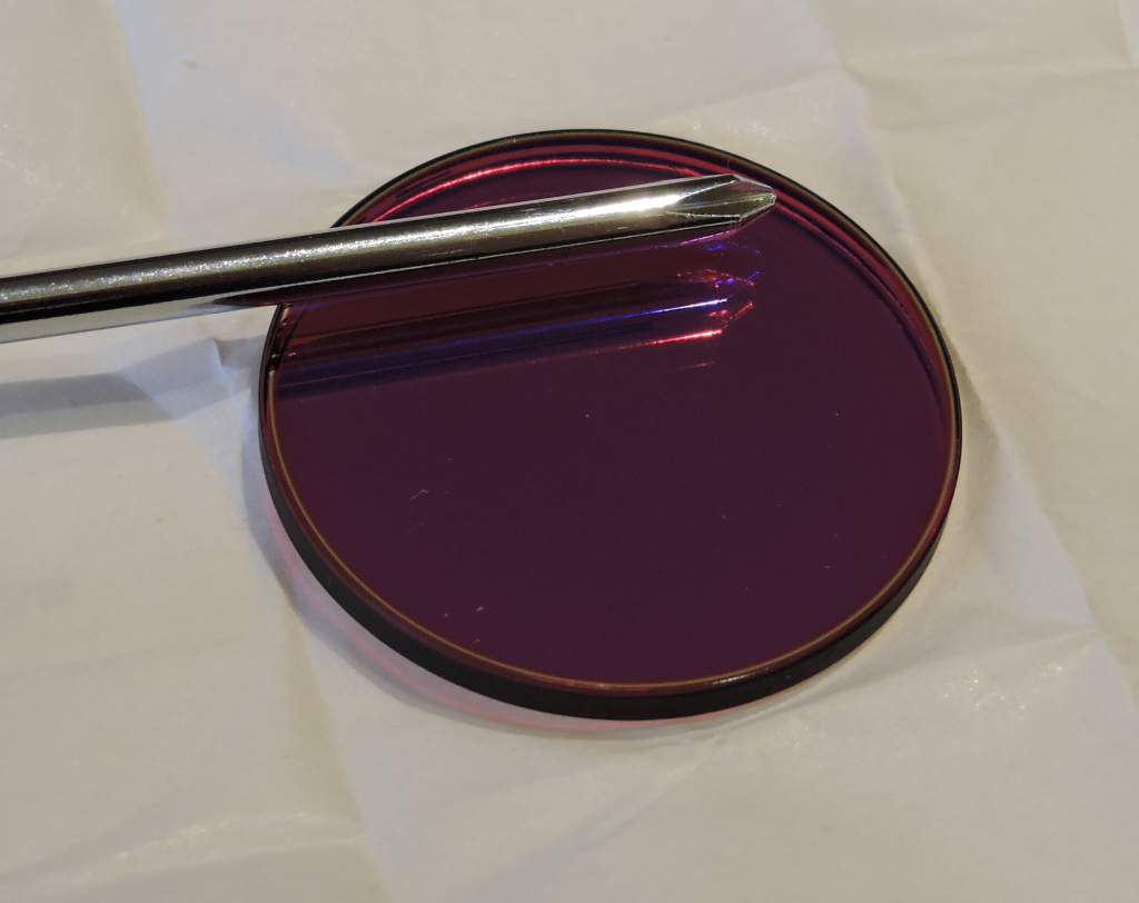 Bei der Bestückung des Filterrades mit den Linienfiltern (Ha, [OIII], [SII]) ist auf die richtige Orientierung der Filter zu achten. Bei Ha und [SII] ist das relativ einfach, die deutlich farbige Seite muss in die Richtung der Kamera zeigen, die silbrig verspiegelte Seite muss zum Teleskop zeigen. Bei dem [OIII]-FIlter sehen jedoch beide Seiten fast gleich aus. Hier kann über das Spiegelbild eines Gegenstandes (ich habe den mitgelieferten Schraubendreher verwendet) die richtige Seite herausgefunden werden: