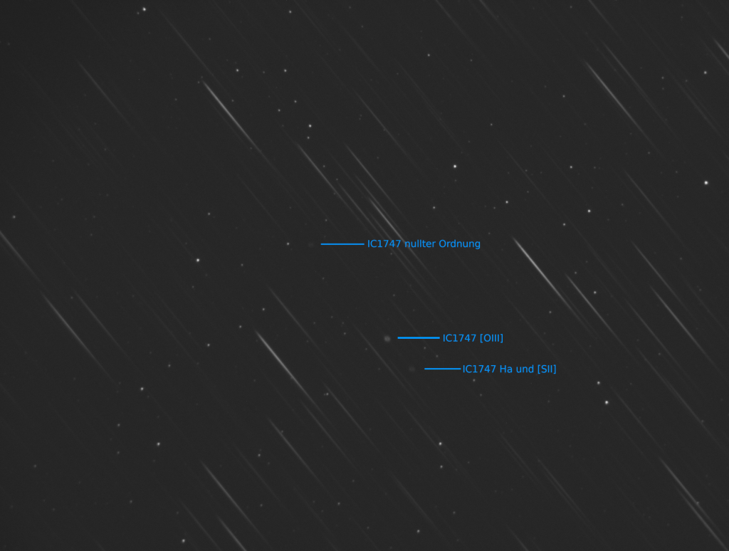 Auf allen oben gezeigten Bildern ist es kein Problem, IC1747 zu entdecken, wenn man weiß, wo er liegt. Aber worin unterscheidet sich denn ein PN deutlich von einem Stern? Er strahlt nicht in einem kontinuierlichen Spektrum. Man sollte ihn also deutlich auf einer abbildenden Spektralaufnahme erkennen können. Es sollten sich, anstatt eines kontinuierlichen Spektralstreifens eines Sternes, mehrere diskrete Abbildungen in den [OIII], Ha, [SII] usw. Farben erkennen lassen. In einer Abbildung durch ein Liniengitter gibt sich der PN deutlich zu erkennen: