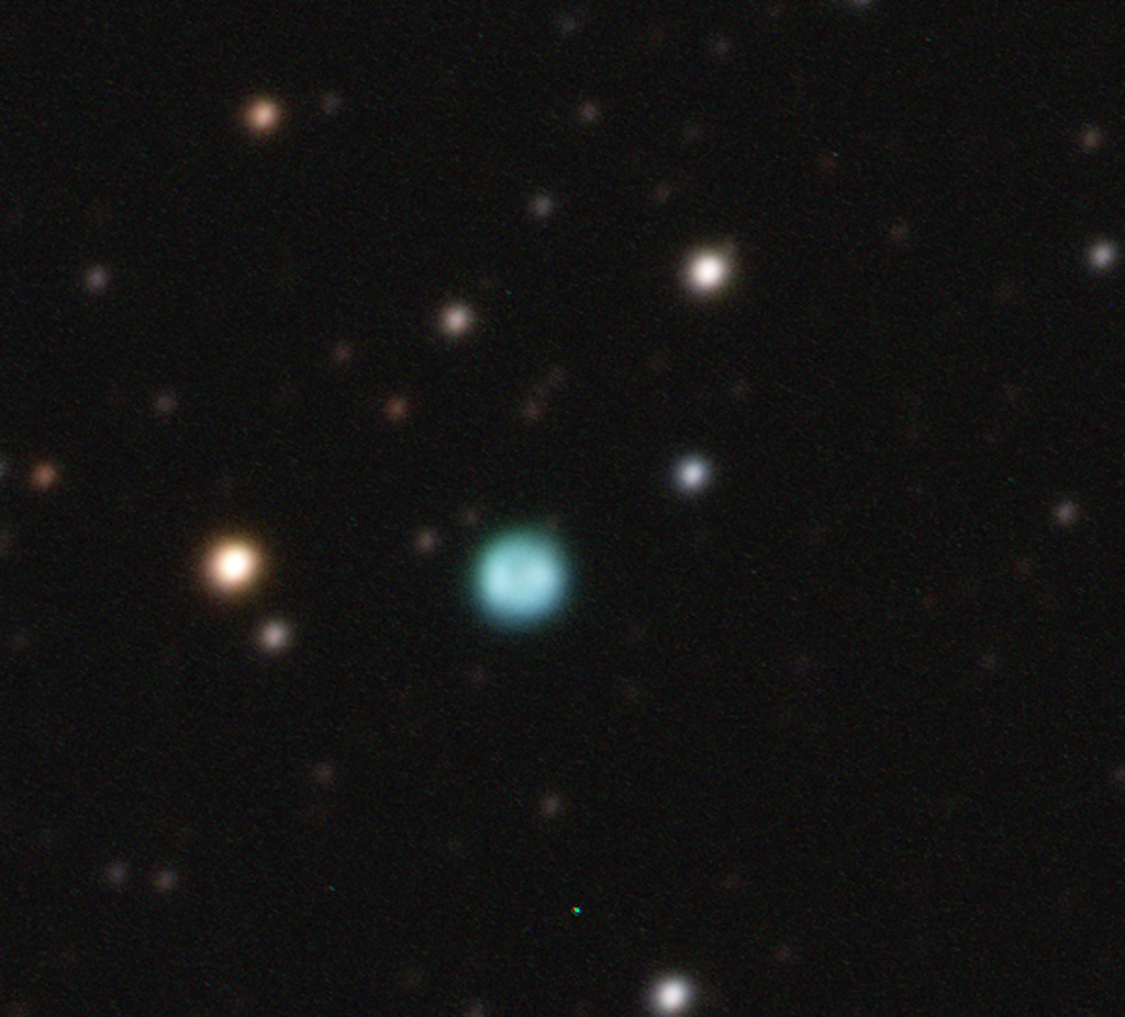Werden drei Aufnahmen, jeweils im roten, grünen und blauen Licht zu einer Farbaufnahme kombiniert, kann der Nebel entdeckt werden, IC1747 erscheint im fahlen, blaugrünen [OIII]-Licht. Wird IC1747 stark vergrößert, erkennt man auf dem blaugrünen Scheibchen ganz leicht Strukturen, die auf den Sternenscheibchen fehlen.