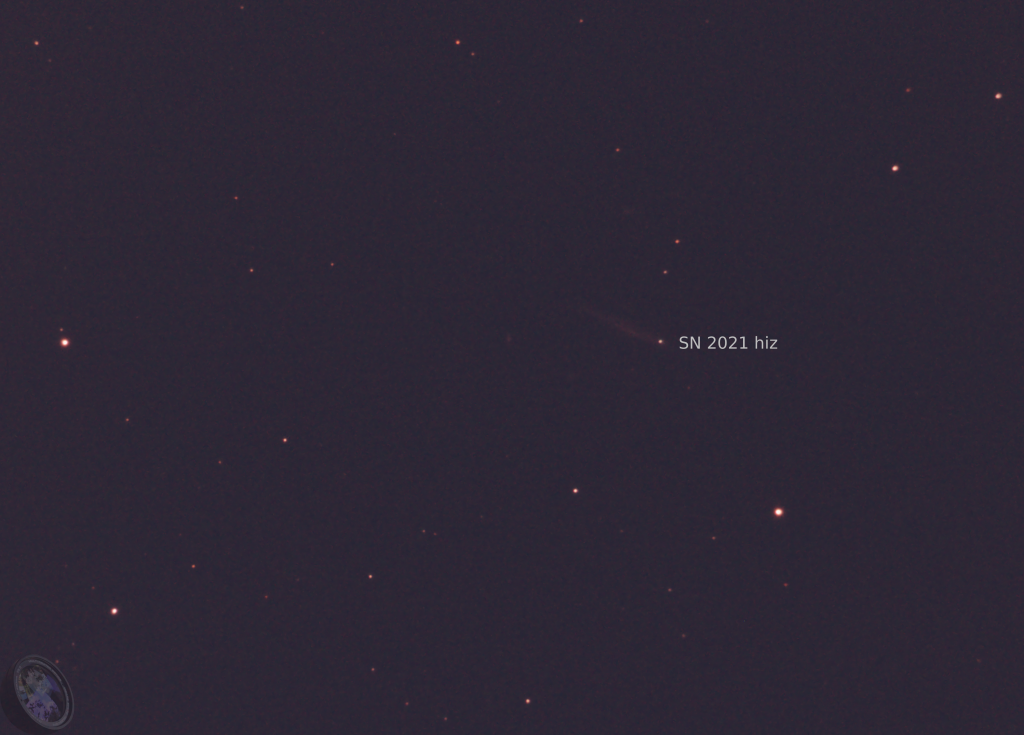 Am 30.03.2021 wurde in der Galaxie UGC 7513 im Virgo-Haufen im Sternbild „Jungfrau“ (Vir) eine Supernova vom Typ Ia entdeckt. UGC 7513 ist ca. 75 Millionen Lichtjahre von uns entfernt. Die Supernova hat eine Helligkeit von ca 13mag. Die Galaxie lag am 27.04.2021 sehr nahe am Vollmond, hebt sich jedoch nach 3×60 sec. Belichtungszeit deutlich vom Himmelshintergrund ab. Unten rechts an der Galaxie befindet sich die Supernova mit der Bezeichnung SN 2021 hiz als heller Punkt.