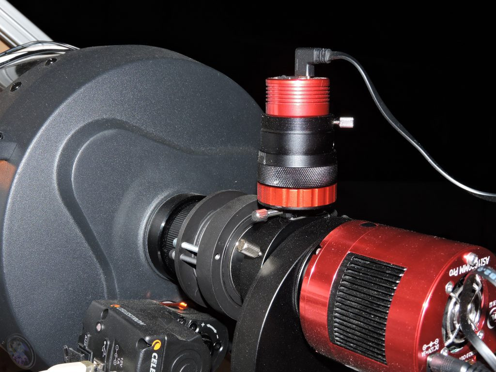 SC-Gewindeüberwurf, der Rotator, der OAG, das Filterrad und dann die Hauptkamera. Logischerweise ist das Filterrad hinter dem OAG, der Leitstern sollte nicht auch noch durch einen Filter verdunkelt werden. Auf dem Bildern ist deutlich ersichtlich, wie eng es hinter dem C9.25 zugeht. Der Celestron-Fokusiermotor nimmt einiges an Platz weg, der Rotator musste so schlank wie möglich werden!