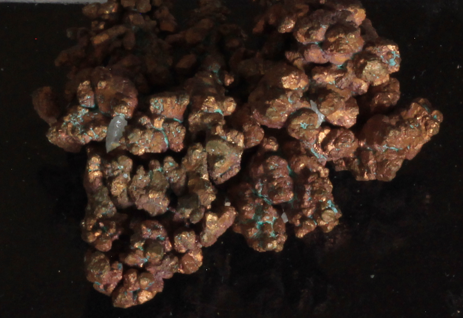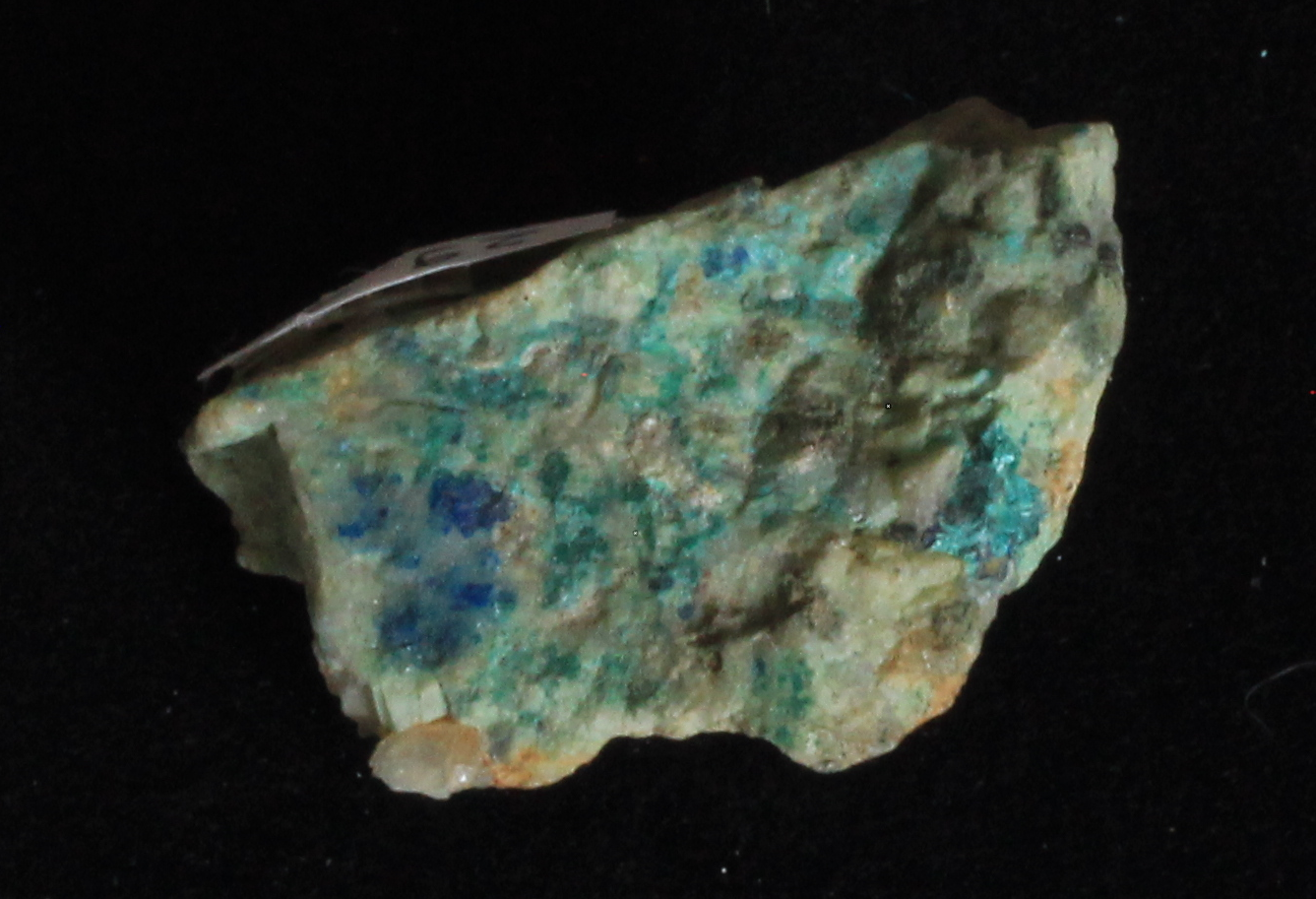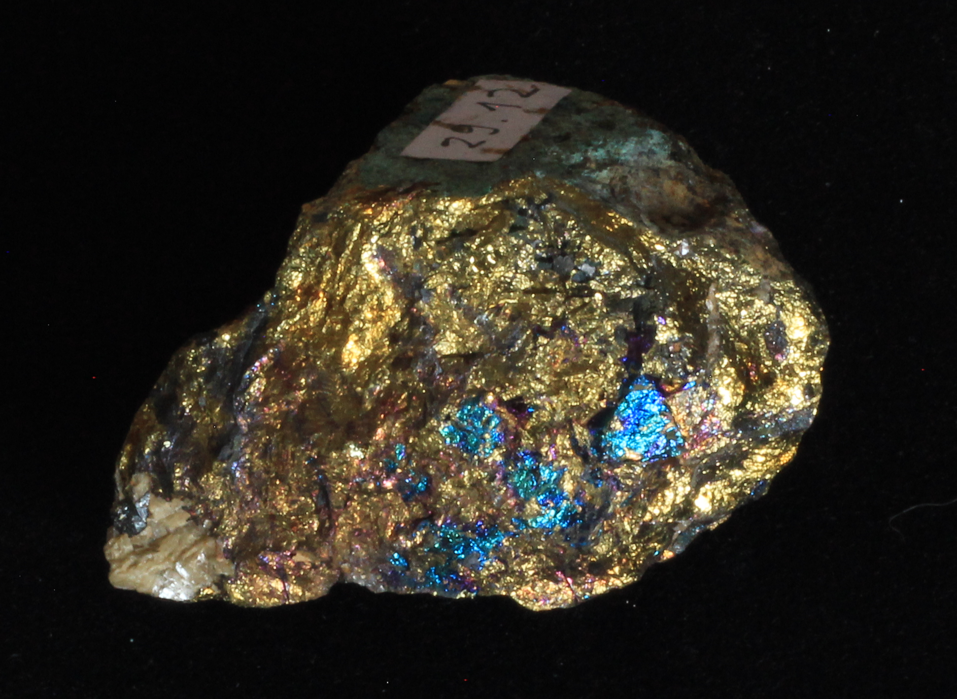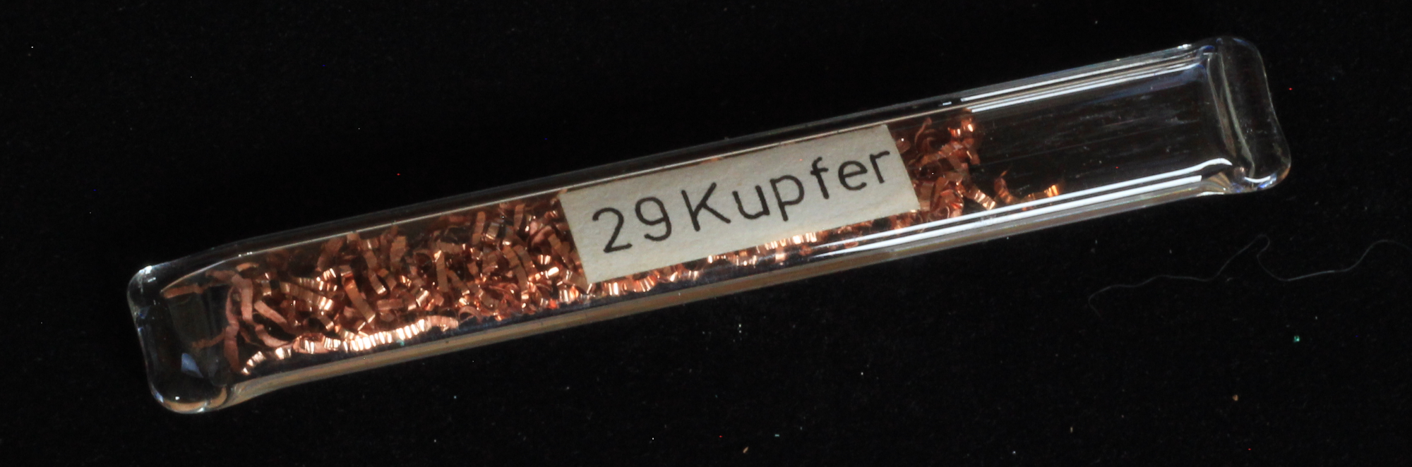 Kupfermineralien [Cu, 29]. Kupfer bildet mit die buntesten und schönsten Mineralien aus. Vorherrschende Farben sind grün und blau, im Chalkopyrit (CuFeS2) bildet es einen wunderschönen, goldenen Glanz aus.